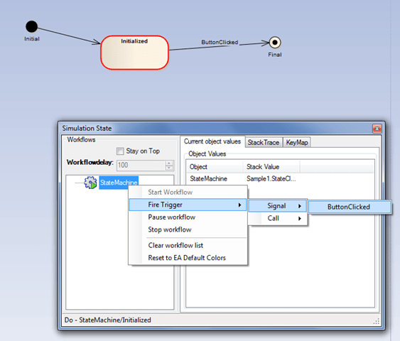 Der aktuelle Zustand in dem die Simluation sich befindet wird dabei jeweil rot umrandet. Um nun zum Ende des Workfows zu gelangen kann im Zustand “Initialized” mittels Rechts-Klick | Fire Trigger eine Liste aller Trigger aufgerufen werden. Unser Trigger sollte unter “Signals” erscheinen. Sobald der Trigger simuliert wurde geht der Automat in den Endzustand über.