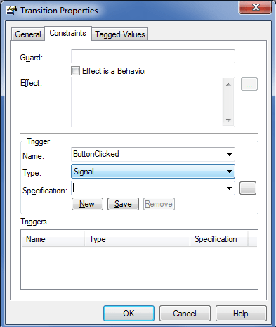 Der Transition “ButtonClicked” fügen wir einen einfachen Trigger hinzu, welchen wir dann in der Simulation feuern können. (Abb. 5)