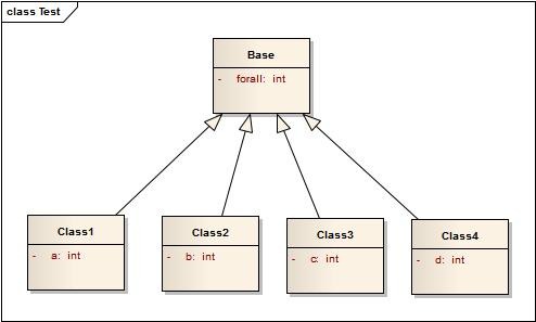So we needed to check if the Base element is of type: Class1, Class2,… to get all our attributes and some class specific functions called.