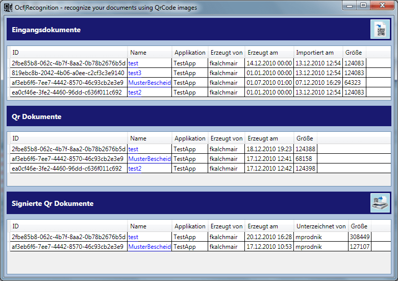 Ocf|Recognition löst diese Herausforderung mit QrCodes. Auf das gewünschte Dokument wird an einer definierten Position ein QrCode aufgebracht. Dieser QrCode stellt im wesentlichen eine eindeutige ID (Guid) dar. Das Dokument kann dann ausgedruckt und unterschrieben werden. Mit Ocf|Recognition lässt sich das unterschriebene Dokument wieder einscannen, wird über den QrCode