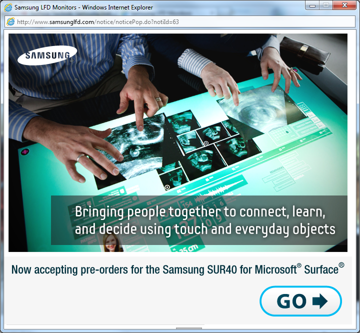 Na bitte – endlich geht es los und man kann den “Surface V2” bestellen. Wenn man die Webpage der Large Format Division von Samsung anwählt: www.samsunglfd.com dann bekommt man folgendes Fenster.