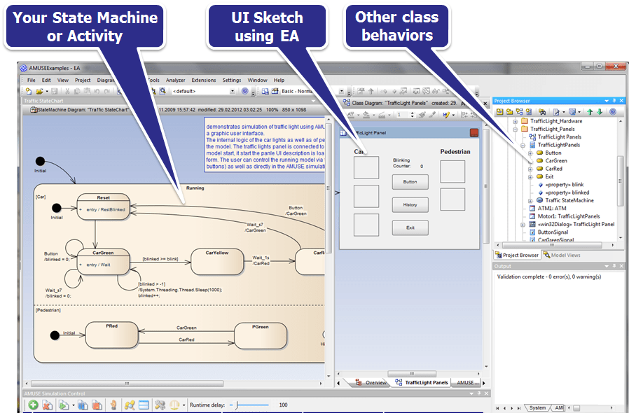 Execution of State Machine is nothing new for AMUSE, but generating GUIs from UI sketch drawn in the EA and control them using a state machine is definitely something new in the AMUSE 2.5 coming soon:
